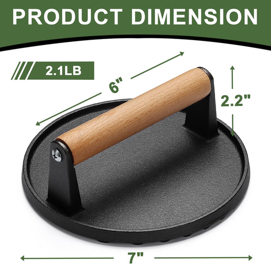 Burger Press, 7" Round Heavy-Duty Cast Iron Smash Bacon Press Meat Steak with Wood Handle for Griddle, Sandwich, Nonstick Pan